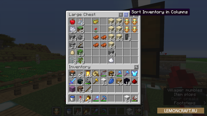 Мод на сортировку инвентаря Inventory Profiles добавляет в игру три кнопки, которые позволят произвести быструю сортировку инвентаря вашего персонажа или его сундука. Вы сможете сортировать товар полностью, по колонкам и по рядам. Так же в игре появится специальный интерфейс (открывается сочетанием клавиш R + C), для управления всем процессом.
